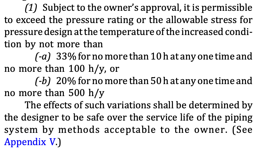 The relevant section of ASME Code for Pressure Piping B31.3 (§302.2.4) states: